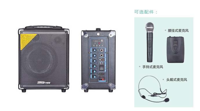 Smtar 声美特 MT-61AU 100W 移动音箱 手提音响 无线扩音机,6.5寸低音喇叭×1,高音×1。带蓝牙、USB,SD,MMC卡功能。音频输入可随身接听,USB、MP3、DVD、VCD、CD,带遥控功能。数字功放采用日本松下原装IC。
