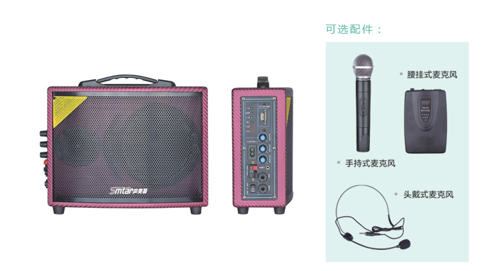 Smtar 声美特 ST-12 100W 移动音箱 手提音响 无线扩音机 5寸低音喇叭×1,高音×1。USB,SD,MMC卡功能。音频输入可随身接听,USB、MP3、DVD、VCD、CD。数字功放采用日本松下原装IC。